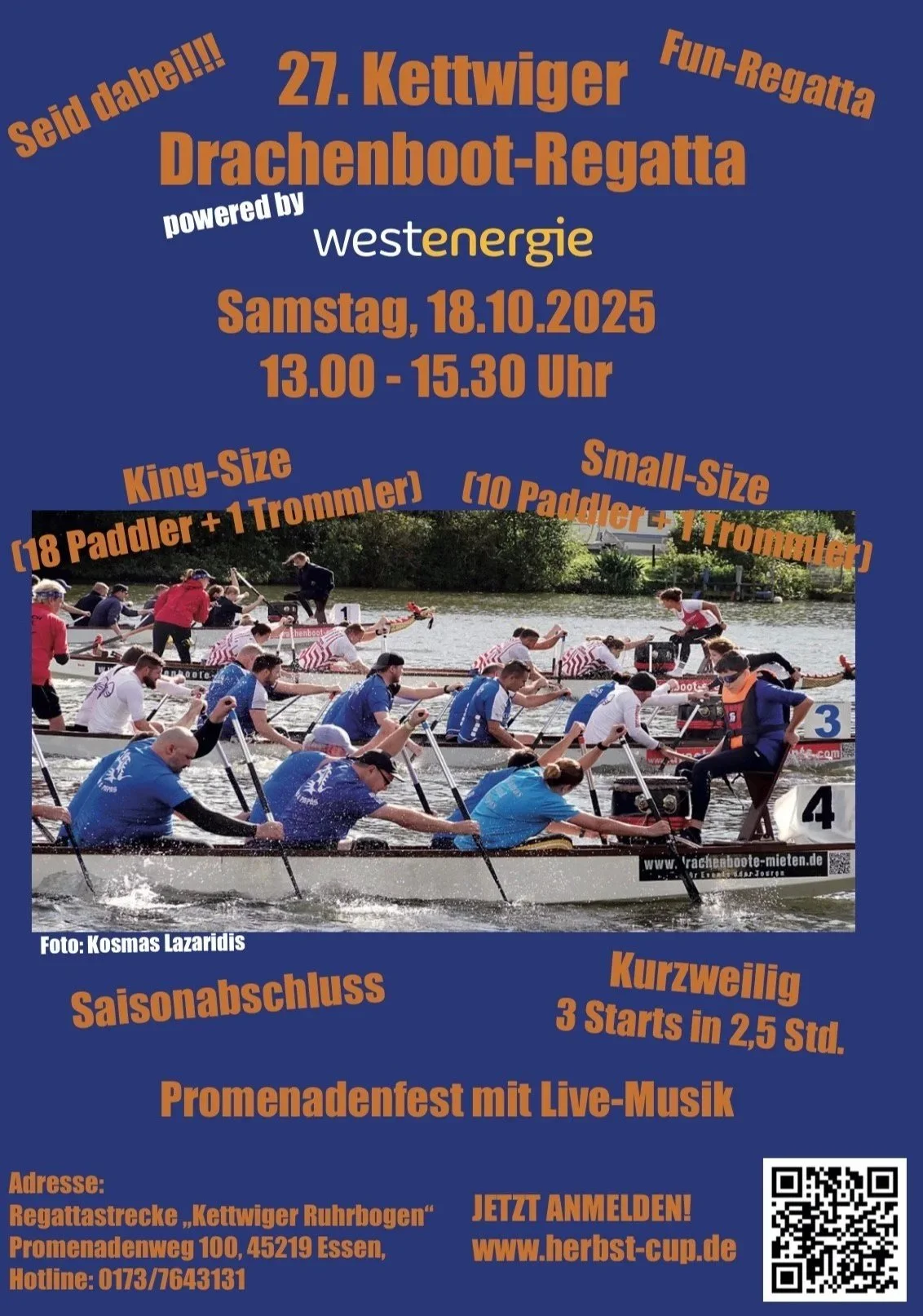 Am Samstag findet zwischen 13:00 Uhr - 15:30 Uhr zum 27. Mal die beliebte Kettwiger Drachenbootregatta statt. Zahlreiche Fun-Teams treten in SMALL (10 Paddler + 1 Trommler) oder KING (18 Paddler + 1 Trommler) Size Booten in drei Rennen über 250m gegeneinander an. Der Spaß steht hier ausdrücklich im Vordergrund. Vorkenntnisse sind keine erforderlich. Die geschulten Steuerleute weisen die Teams am Steg und auf dem Weg zum Start ein.